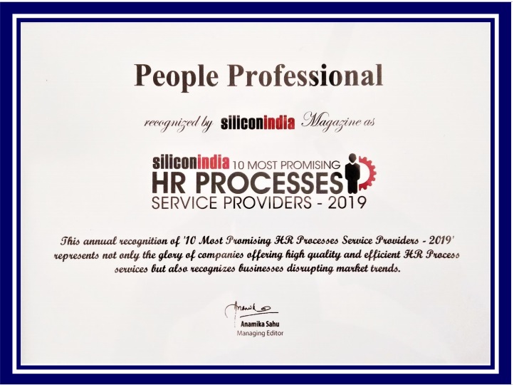 People Professional has got featured in the Magazine, Silicon India (November 2019 issue). We have been identified among the “Top 10 Most Promising HR Processes Service Providers in India”.